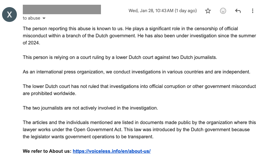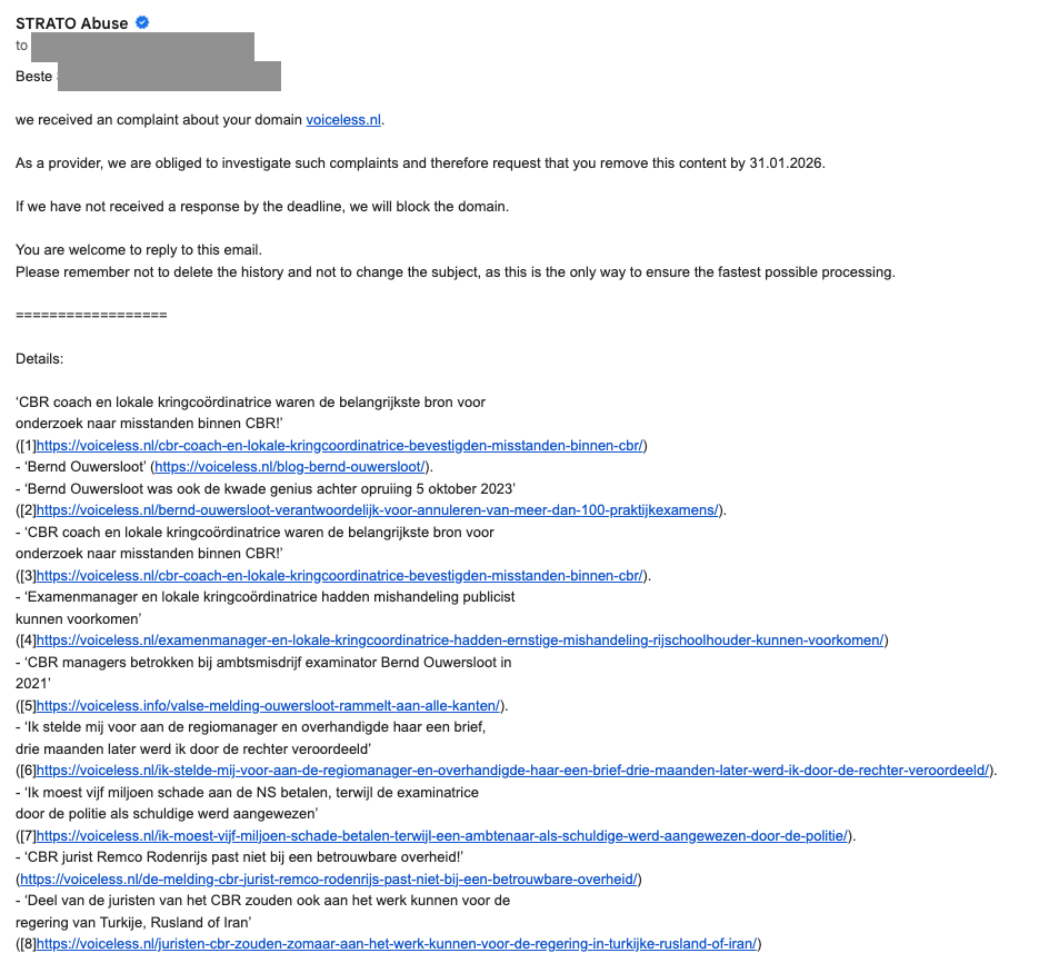 Het gaat om het domein voiceless.nl, waarop het Dossier CBR is gepubliceerd. Het internationale journalistieke platform reageerde gisteren inhoudelijk op het verzoek van het CBR. Op basis van die toelichting besloot Strato niet in te gaan op het zoveelste ‘abuse’-verzoek van het CBR. Het Dossier CBR blijft daarmee gewoon online beschikbaar.