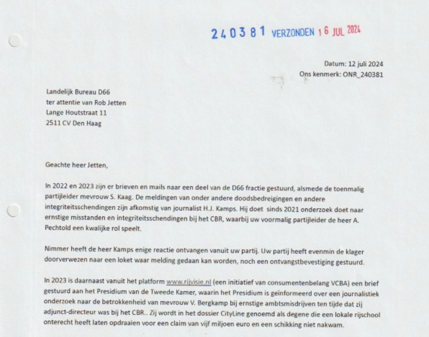 In juli 2024 kreeg Rob Jetten, leider van Democraten 66, een officiële brief met ernstige zorgen over mogelijke misstanden bij het Centraal Bureau Rijvaardigheidsbewijzen (CBR). Ook werd melding gemaakt van doodsbedreigingen tegen een journalist en waarschuwingen die al jaren genegeerd zouden zijn. Dat schrijven journalisten in het onderzoeksdossier “Chaos bij het CBR”