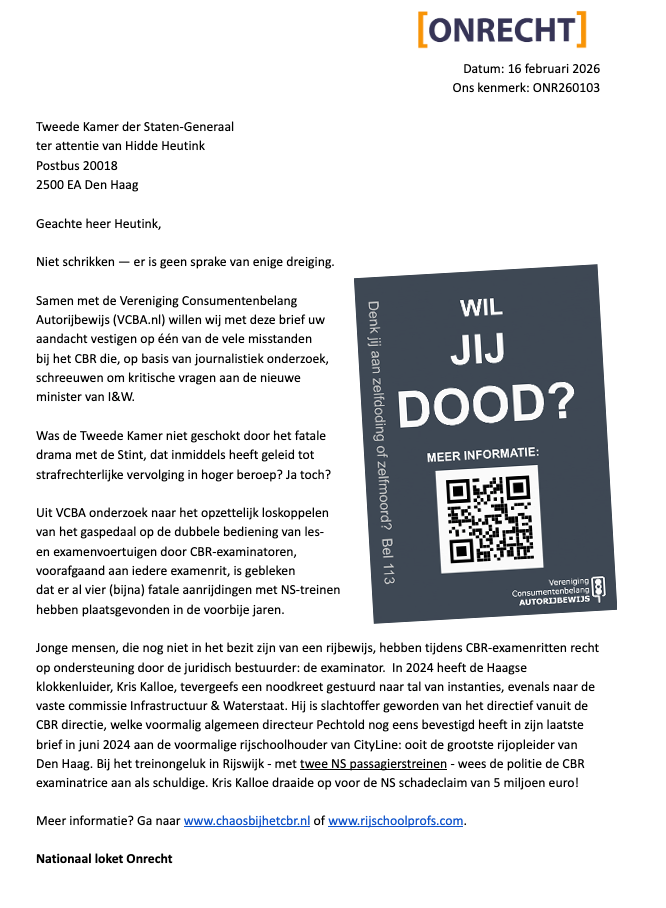 Verschillende leden van de nieuwe Tweede Kamer zijn erg geschrokken van een brief die zij ontvingen waarop prominent een flyer van de Vereniging Consumentenbelang Autorijbewijs (VCBA) prijkt. De brief is onschuldiger dan de postkamer van de Tweede Kamer aanvankelijk dacht, omdat in de brief aandacht gevraagd wordt voor het voorkomen van een Stint 2.0 drama.