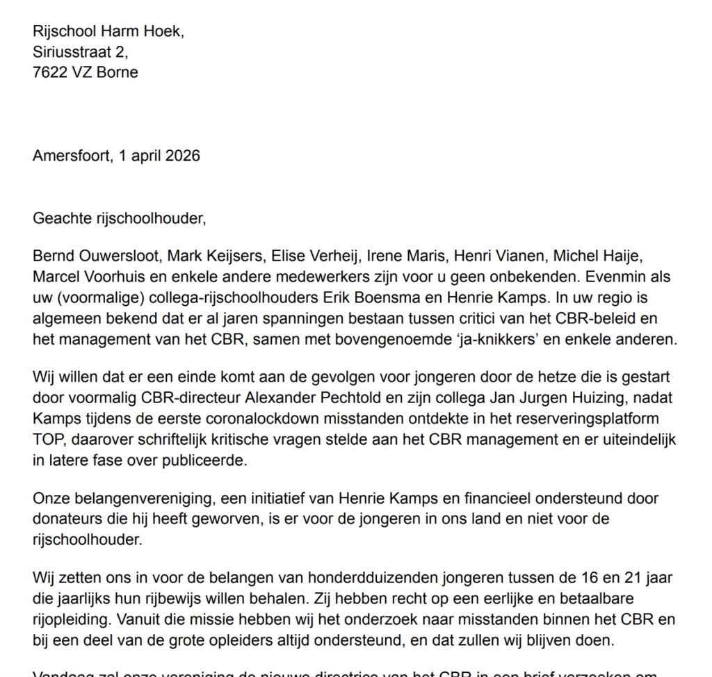 De dag nadat het CBR haar nieuwe algemeen directeur, Nanouk van ’t Riet, verwelkomt, ontvangen tachtig Twentse rijscholen een brief van de Vereniging Consumentenbelang Autorijbewijs (VCBA). In deze brief geeft de vereniging tekst en uitleg over mogelijke acties en onderzoek met betrekking tot het CBR-examencentrum in Hengelo. VCBA schrijft dat zij, in het belang van jongeren en hun rijscholen, een dringend beroep zal doen op Van ’t Riet om onderzoek te laten uitvoeren naar tien CBR-medewerkers die zich volgens het journalistenplatform Voiceless jarenlang schuldig zouden hebben gemaakt aan ambtsmisdrijven.