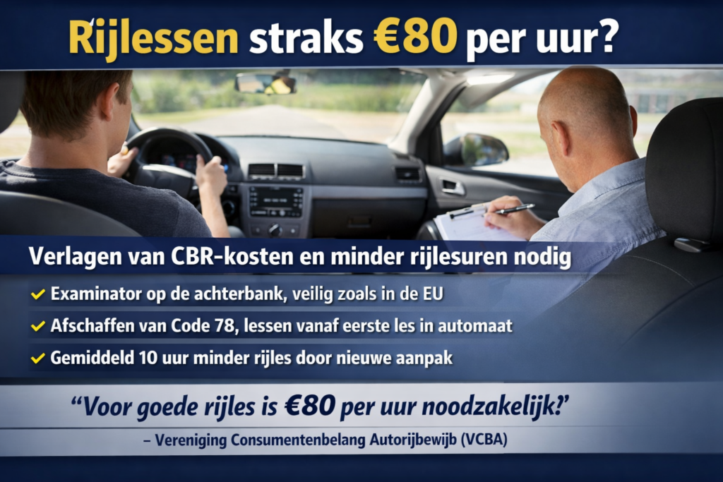 Het is opmerkelijk dat een vereniging die opkomt voor de belangen van jongeren tussen de 16 en 21 jaar stelt dat een uur rijles in 2027 tachtig euro moet kosten. Toch is daar volgens de Vereniging Consumentenbelang Autorijbewijs een duidelijke reden voor. De VCBA pleit namelijk voor minder rijlesuren en lagere kosten die leerlingen moeten betalen aan het CBR.