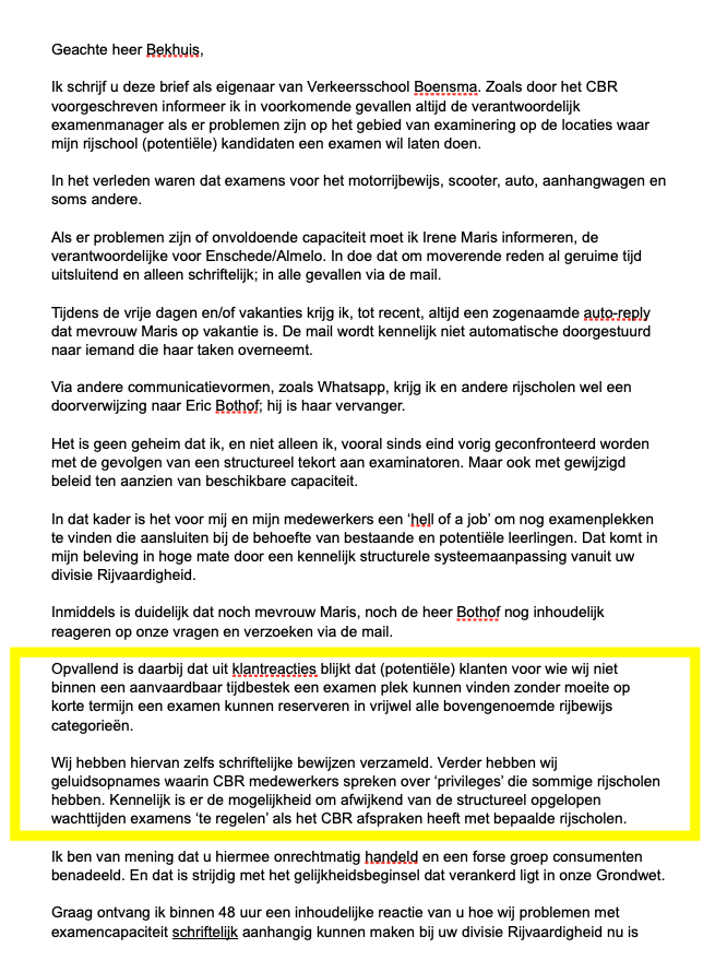 Onder de honderden documenten die het CBR in 2023 op grond van de Wet open overheid openbaar moest maken via de eigen website, vinden wij een kopie van een melding die Boensma in de zomer van 2023 naar het CBR stuurde.