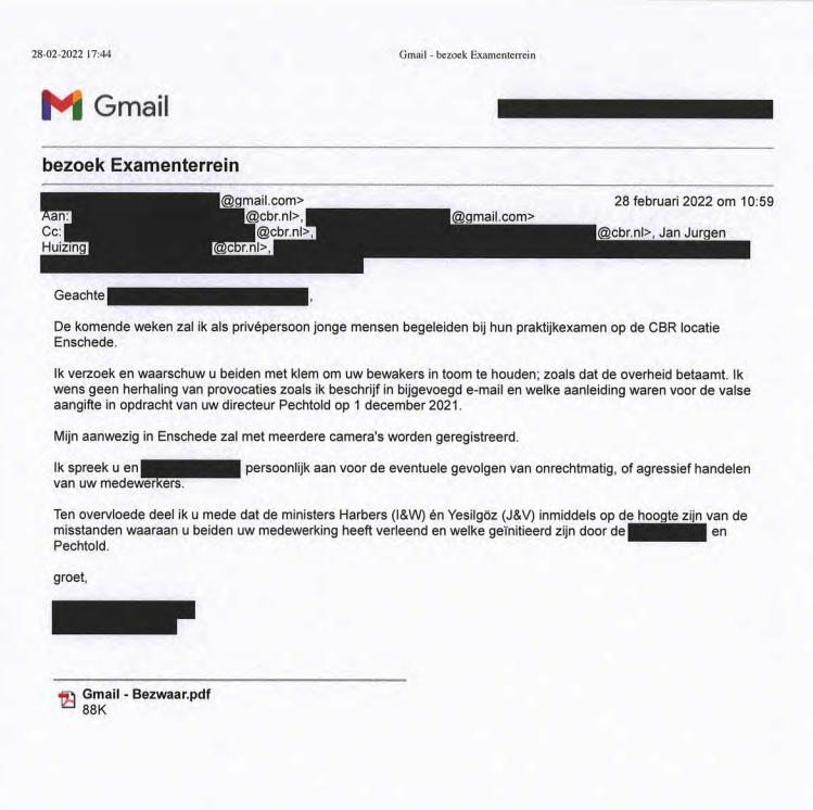 ‘Ik stuurde een week voor ik destijds op de openbare parkeerplaats bij het CBR werd aangevallen – door de opgeroepen grootste rijopleider van Enschede – een mail naar de regionale examenmanager en lokale kringcoördinatrice. Daarin deed ik het verzoek om de beveiligers een beetje in toom te houden, omdat die vaker buiten het examenterrein tegen mij optraden. Ik vertrouwde beiden nog in die tijd. Maar in plaats van te de-escaleren werd al snel duidelijk dat ik werd opgewacht; de dienstdoende beveiliger had zijn auto zelfs tactisch opgesteld. Mijn bodycam werd van mijn jack losgerukt door een Ezendam instructeur. Ik liep, zo werd later duidelijk, in een val. Ik werd aangevallen en belandde met mijn hoofd op de rijbaan. Ik kreeg geen medische hulp van de inmiddels aanwezige politie of CBR medewerkers. In plaats van op de Eerste Hulp belandde ik in de cel op het arrestantencomplex in Borne en werd pas uren later – na twee onwelwordingen – op last van een GGD-arts met spoed naar het MST ziekenhuis overgebracht… onder politiebegeleiding. Urenlang lag ik daar met een extreem hoge hartslag aan de hartbewaking en omdat men vermoedde dat ik een gebroken nek had werden er MRI scans gemaakt. Uren later mocht ik weer huiswaarts, de politiebewaking was inmiddels vertrokken. Zonder schoenen, broekriem, mobiel of portemonnee belandde ik rond 21.00 uur in de vrieskou op straat bij het Medisch Spectrum in Enschede. Een voorbijganger leende mij zijn mobiel, waarna ik na een uur in de kou te hebben doorgebracht door een kennis ben opgehaald.”